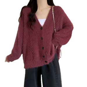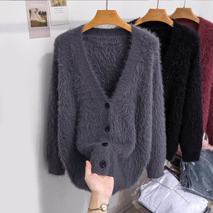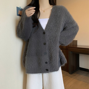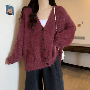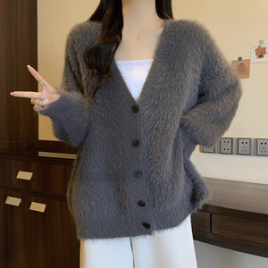 慵懒风针织衫女外套秋冬新款宽松韩版V领复古仿貂绒毛衣外套开衫
