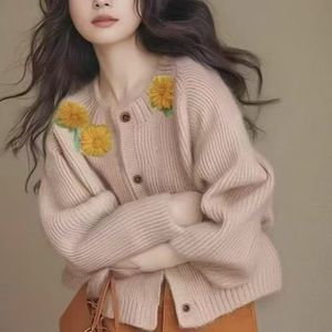 2025年新款秋冬刺绣提花针织衫开衫毛衣女宽松短款小个子外套上衣