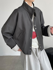 滔川 韩系复古短款蝙蝠袖外套女卷边立领单排扣风衣夹克2808