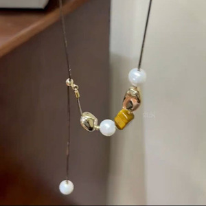 天然虎眼石珍珠串珠抽拉项链女铜镀真金法式长款吊坠流苏颈链项饰