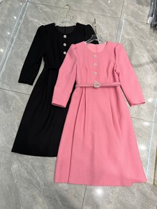 2025秋季新款时尚百搭圆领长袖配腰带收腰显瘦纯色连衣裙批发