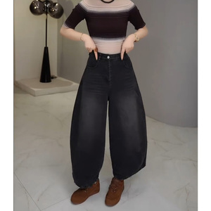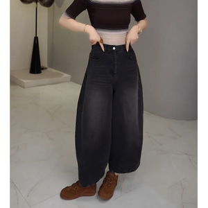牛仔裤女士早秋新子显瘦九分裤高腰弯刀阔腿裤黑色