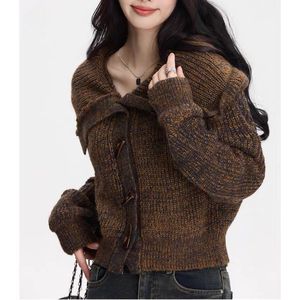 秋冬新款女装高领短款上衣春装慵懒外套棕色牛角扣翻领毛衣开衫女