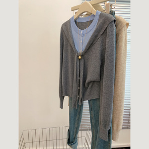 灰色假两件长袖针织衫女士薄款2025新款高级感上衣早秋氛围感穿搭
