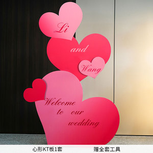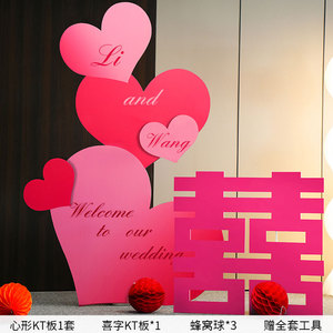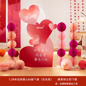 【可姓名】爱心kt板+双喜摆件+蜂窝球立柱(深粉)