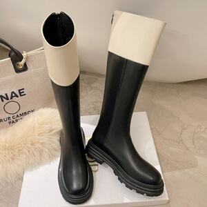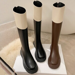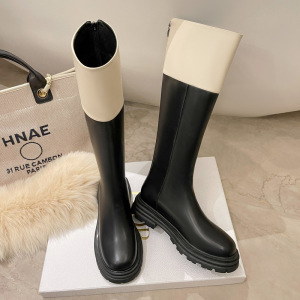 软皮版~拼接长筒靴2025年秋冬新款高筒靴拼色厚底后拉链骑士靴子