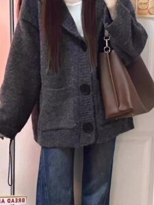 韩系chic灰色连帽毛衣外套开衫女秋季厚宽松显瘦慵懒风针织衫上衣