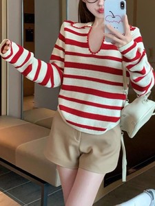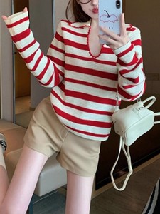 红色条纹翻领针织长袖t恤女2025新早秋款宽松休闲慵懒v领撞色上衣