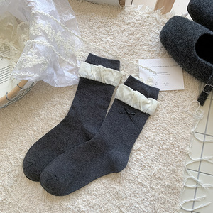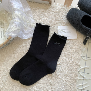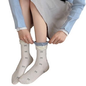 波点蝴蝶结袜子女时尚百搭芭蕾风中筒袜甜美泡泡口堆堆袜白色袜子