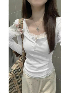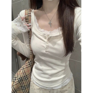 蕾丝花边假两件甜美风长袖t恤女秋季修身款拼接碎花绝美打底上衣
