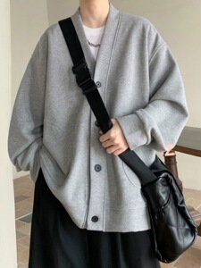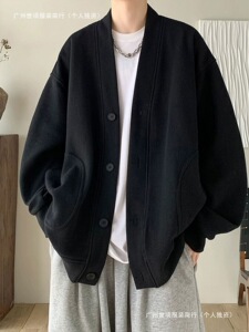 纯黑色日系慵懒风外套男潮感华夫格V领针织开衫情侣春秋夹克