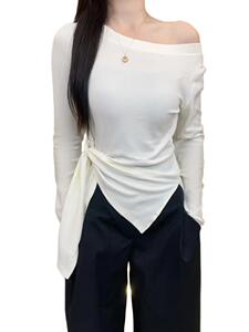 条纹不规则开叉斜肩长袖T恤大码胖mm韩系女装早秋收腰设计感上衣