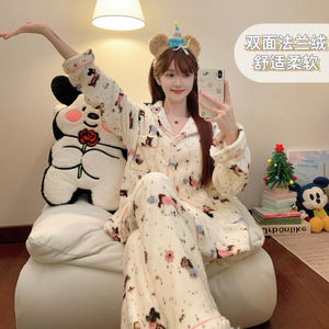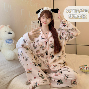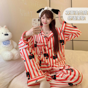 法兰绒睡衣女秋冬季新款韩系卡通条纹长袖加厚保暖少女家居服套装