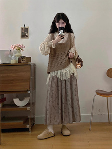 大码女装秋冬复古文艺穿搭长袖晕染蕾丝打底衫针织背心配半身裙