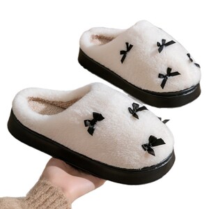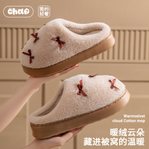 棉拖鞋女士新款厚底家居时尚蝴蝶结拖鞋冬季加绒加厚保暖外穿防滑