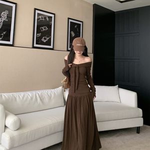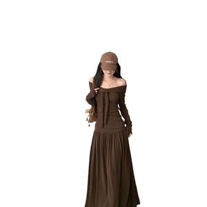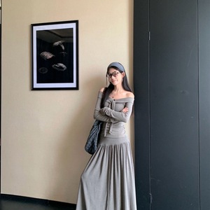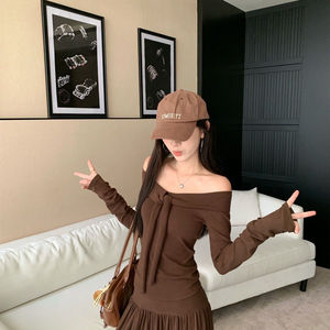 一字肩灰色飘带长袖修身T恤女秋季休闲套装高腰a字裙半身裙两件套