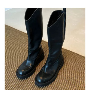 牛皮~真皮复古V口马丁靴女褶皱高筒靴子百搭大筒围显瘦粗跟骑士靴