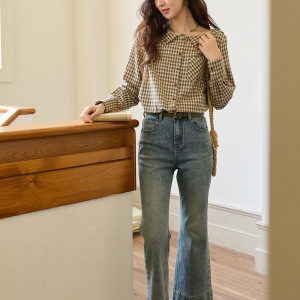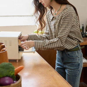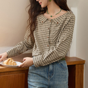 绿格船领衬衫女2025秋季新款斜插袋撞色纽扣收腰衬衣上衣