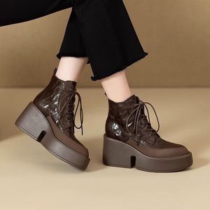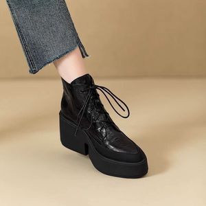 增高厚底尖头2025新款软皮马丁靴秋冬粗跟高跟系带尖头显瘦短靴女