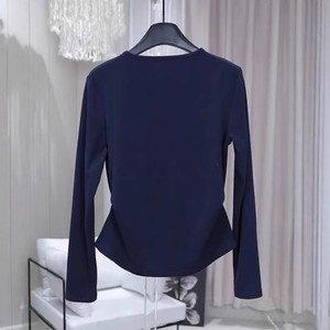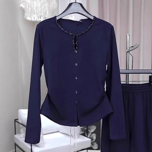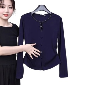 大码女装重工镶钻圆领长袖T恤衫女秋季新款胖mm收腰显瘦减龄上衣