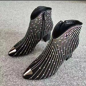 2025秋冬新款金属亮片尖头气质时装靴水钻短靴高档洋气高跟鞋黑色