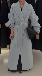跨境慵懒风翻领双面羊毛大衣女气质感可立领毛呢加长款系带外套