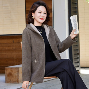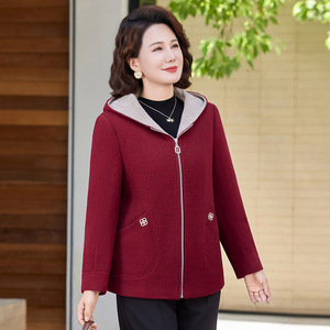 妈妈秋装时尚休闲外套2025年新款秋冬中老年女宽松连帽毛呢上衣服