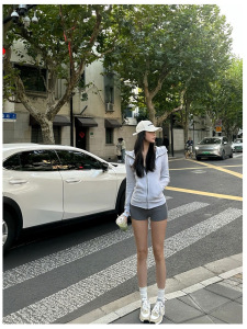 灰色修身卫衣外套女款早秋穿搭正肩收腰连帽上衣显瘦紧身收腰