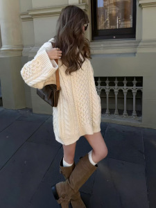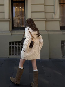 街拍韩国小众连帽中长款绞花女式毛衣宽松慵懒针织裙连衣裙包臀裙