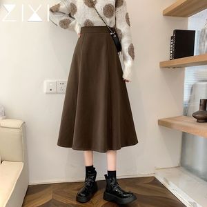 毛呢半身裙女秋冬新款中长款高腰a字裙显瘦伞裙小个子宽松长裙子