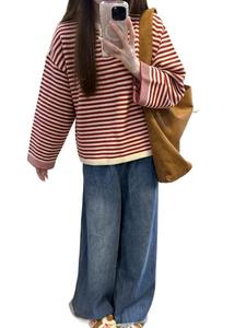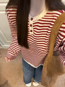红色条纹撞色针织上衣慵懒感秋季穿搭宽松毛衣女2025新款时尚百搭