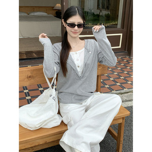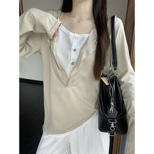 半开领撞色假两件T恤女春秋新款chic设计感长袖宽松百搭显瘦上衣
