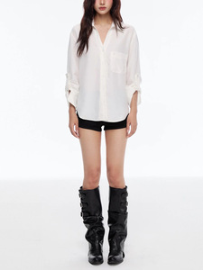 白色V领老钱气质宽松休闲慵懒感亚麻天丝混纺长袖衬衫衣
