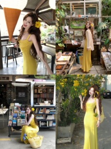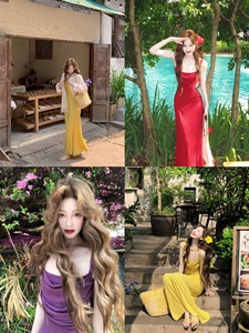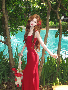 吃绿色菜【海岛精灵】夏天bi入版 荡领不走光针织弹力吊带连衣裙