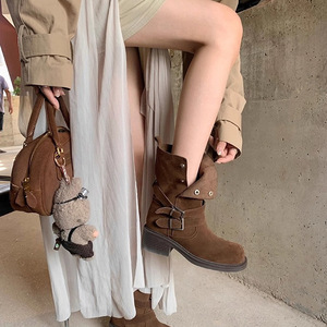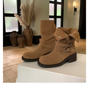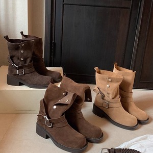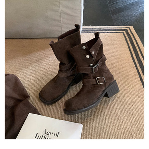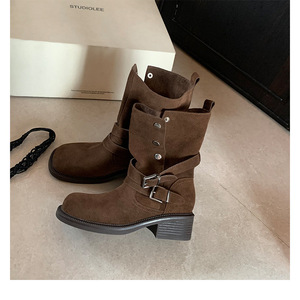 羊皮版~复古美拉德皮带扣粗跟厚底短筒靴女秋冬百搭瘦瘦靴骑士靴