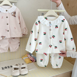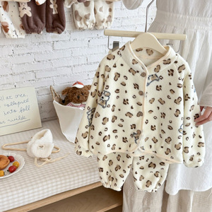 儿童家居服套装雪粒绒男童保暖内衣女宝冬季开衫加绒加厚睡衣批发