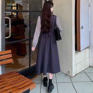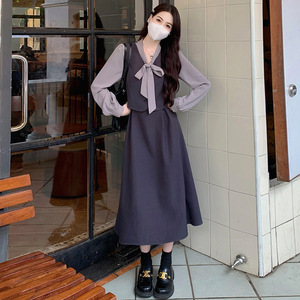 系带蝴蝶结假两件连衣裙女秋季大码胖mm法式高级感气质收腰中长裙