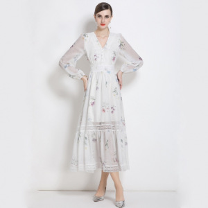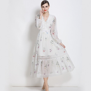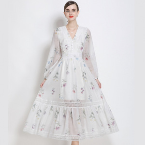 法式海边度假小众设计感超好看别致绝美收腰白色V领印花连衣裙女