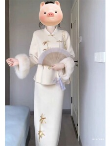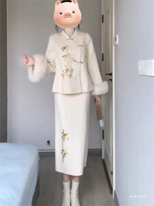 新中式国风套装裙女秋冬款感刺绣毛呢外套+高腰半身裙两件套