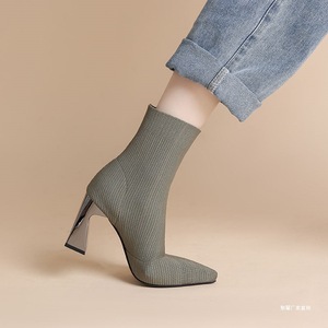 弹力针织袜靴女春秋季新款百搭尖头瘦瘦靴大码单靴粗跟短款高跟鞋