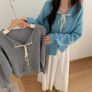 韩系甜美蝴蝶结蕾丝系带领毛衣开衫外套秋季法式软糯针织衫上衣女