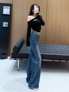 秋季新款复古拼接假两件牛仔裤遮肉显腿长阔腿裤南油女垂感直筒裤