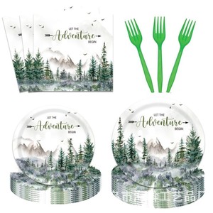 亚马逊新款露营主题派对装饰节日生日纸盘纸巾一次性餐具用品套装