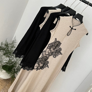 2025初秋新中式无袖旗袍针织连衣裙长裙开衫两件套套装女拼接蕾丝