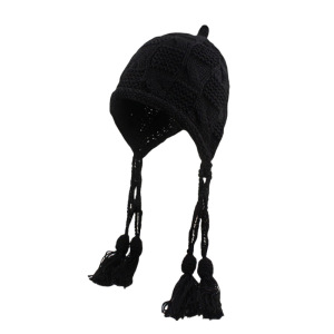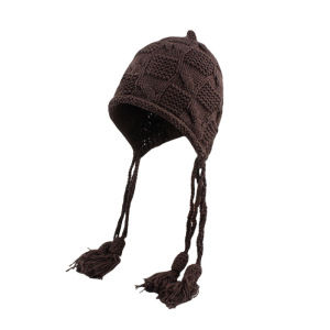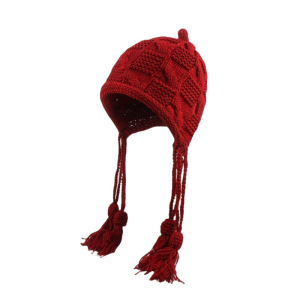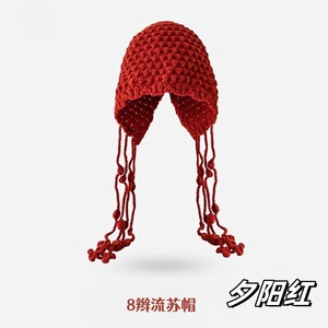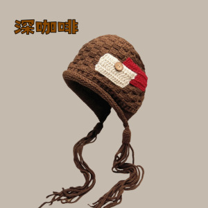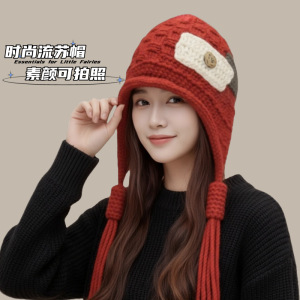 新款时尚补丁毛线帽秋冬季手工辫子流苏帽红色百搭保暖护耳针织帽