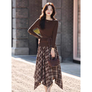 W2F小香风套装裙女秋季高级感别致巨好看不规则复古格子半身裙两