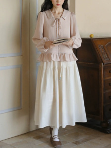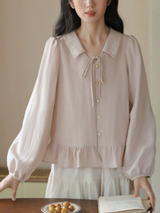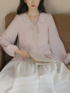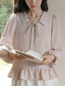 Nesoulu 桃粉色刺绣系带摆荷叶边设计长袖衬衫女秋复古宽松衣
