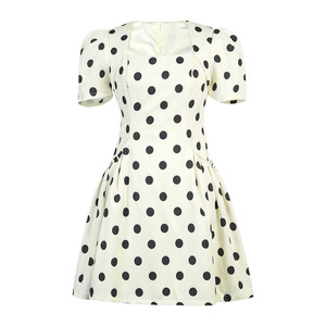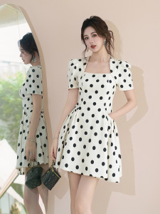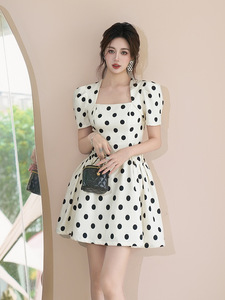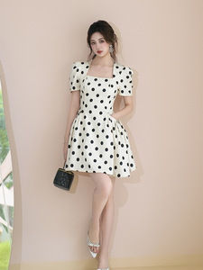 法式方领俏皮收腰泡泡袖波点连衣裙女夏季千金感气质裙子21869