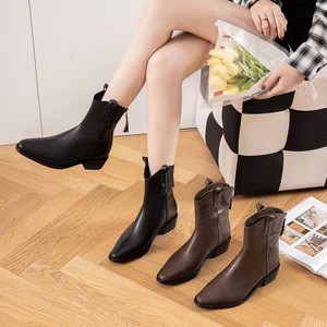 头层牛皮马丁靴2025秋冬新款尖头V口西部牛仔靴复古褶皱粗跟短鞋