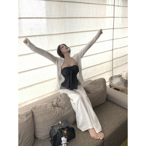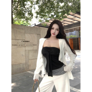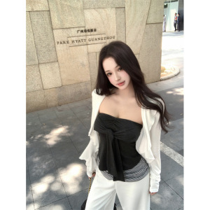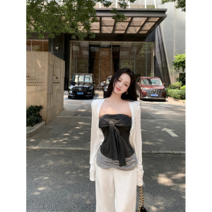韩系辣妹松弛感穿搭罩衫抹胸女拼接条纹腰头休闲裤套装女
